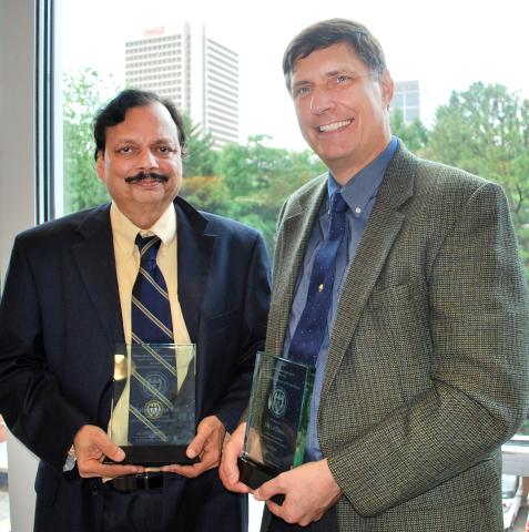 Pictured are Coulter BME faculty Joe Le Doux (left) and Bala Pai (right) who were honored by Georgia Tech for their teaching excellence. BME Professor Younan Xia and associate professor Manu Platt were also honored at the event.