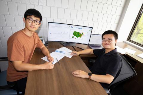 Ph.D. student Simin Ma, left, and Shihao Yang, assistant professor in the H. Milton Stewart School of Industrial and Systems Engineering. They developed a model that uses search data to predict coming waves of serious Covid-19 and flu cases that could burden healthcare resources. (Photo: Candler Hobbs)