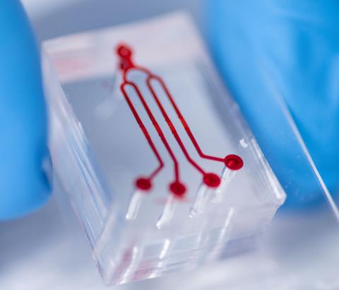 The blood comes in from the top and splits into four channels that can be observed separately. The middle region is where the channel narrows to mimic an atherosclerotic plaque. [Photo by Rob Felt]