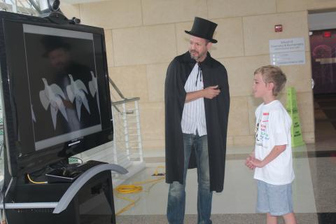 Faculty member, Garrett Stanley, PhD, gives "magical" scientific demonstration to curious visitor