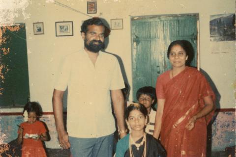 Young Nalini Polavarapu with father, Jagan Mohan Rao (left), and mother, Nagamani (right). Behind are cousins Sanghetta Punukullu (left) and Naren Chalasani (right) (Courtesy of Nalini Polavarapu)