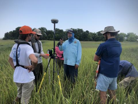 SCDNR Shellfish Biologist Michael Hodges (center) works with Tech alumni Joshua Robinson and Nolan Williams of Robinson Design Engineers (left) and several Georgia Tech graduate students to determine marsh elevation and plant biomass. Credit: Joel Kostka.
