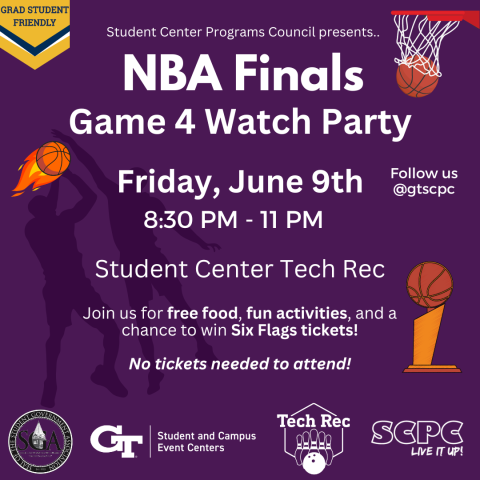 Whether you’re the most devoted basketball fan or are just looking to spend a fun Friday night on campus, join SCPC for an incredible Game 4 NBA Finals Watch Party, starring the Denver Nuggets and Miami Heat, at Tech Rec (1st floor of the Student Center) next Friday, June 9th, at 8:30 PM. No tickets are required. Let's cheer and celebrate as we start the summer off right - and witness history being made on the basketball court!