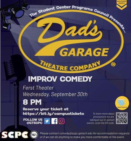 Picture this: a firefighter, an alien, and a sentient dust bunny walk into a bar. Want to know how the rest of the story goes? Or maybe you'd rather give your own ideas to be acted out? Dad's Garage Improv is here to help! Join SCPC and Dad's Garage in the Ferst Center Theater on 9/30 at 8pm for an evening filled with belly-aching laughs and surreal improv scenarios. Masks and social distancing guidelines must be adhered to at all times. Reserve your tickets at https://gatech.universitytickets.com/w/event.aspx?id=1705&p=1.