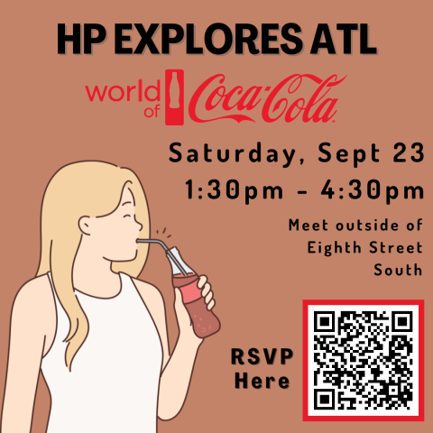 Join us on Saturday, September 23rd for a trip to the World of Coca-Cola museum. We'll be meeting at 1:30pm in front of the Eighth Street South apartments to head towards the location via charter bus, and we will be returning back to campus around 4:30pm. Please RSVP via Qualtrics-- space is limited!