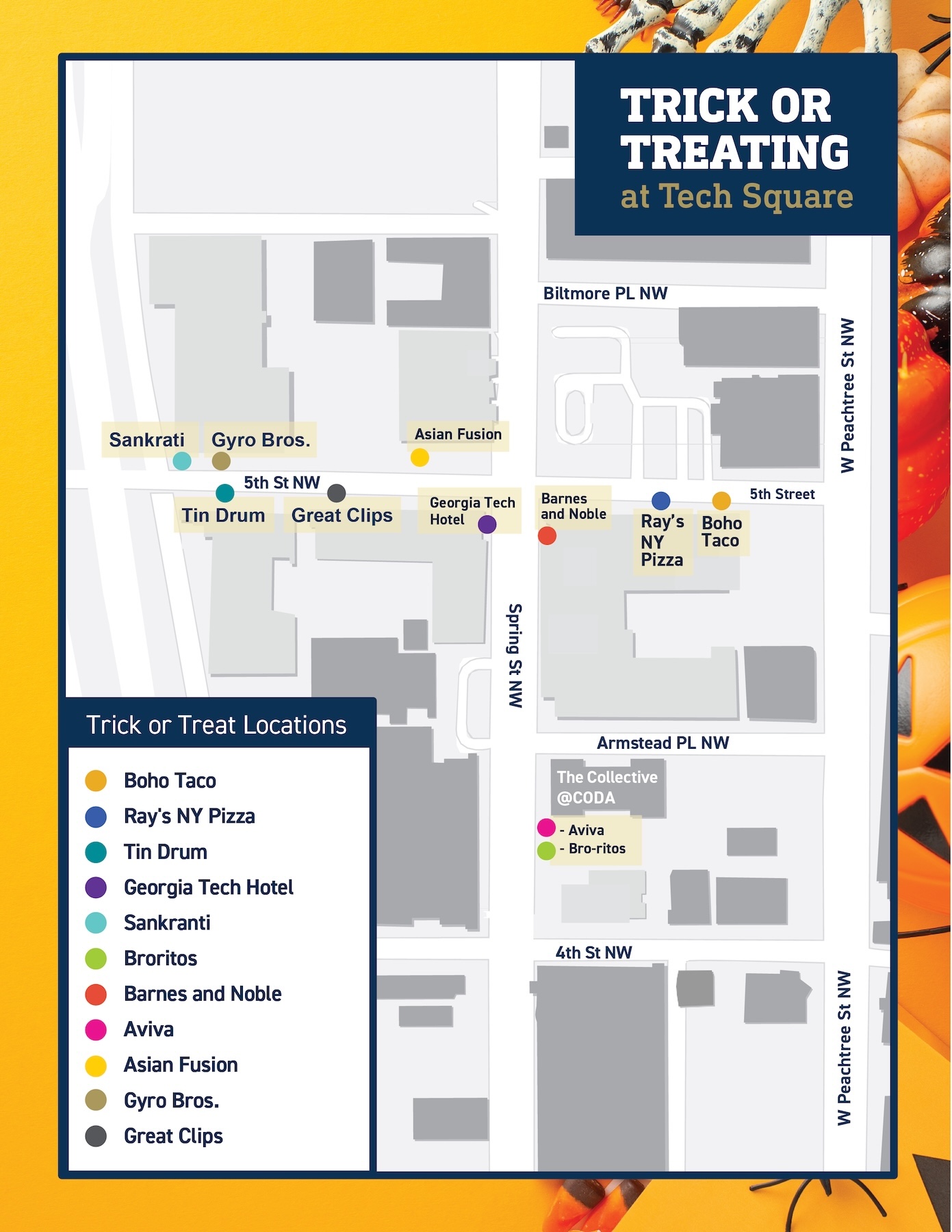 Join Campus Services on Friday, October 31 at 5 p.m. for a festive evening of fun and trick-or-treating through the shops at Tech Square! Costumes are encouraged (just no full face masks inside stores), and all ages are welcome to enjoy the Halloween spirit.